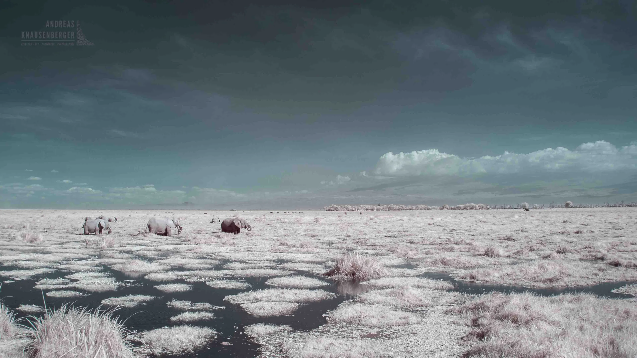 The swamps in Amboseli also provide beautiful contrast between dark water, white foliage, and elephants. The dry lakebed scenes, with elephants walking across cracked soil and dust devils rising behind them, look incredible in IR—especially with some clouds to make the sky pop. Interestingly, the dust devils are more visible in IR than in normal light.