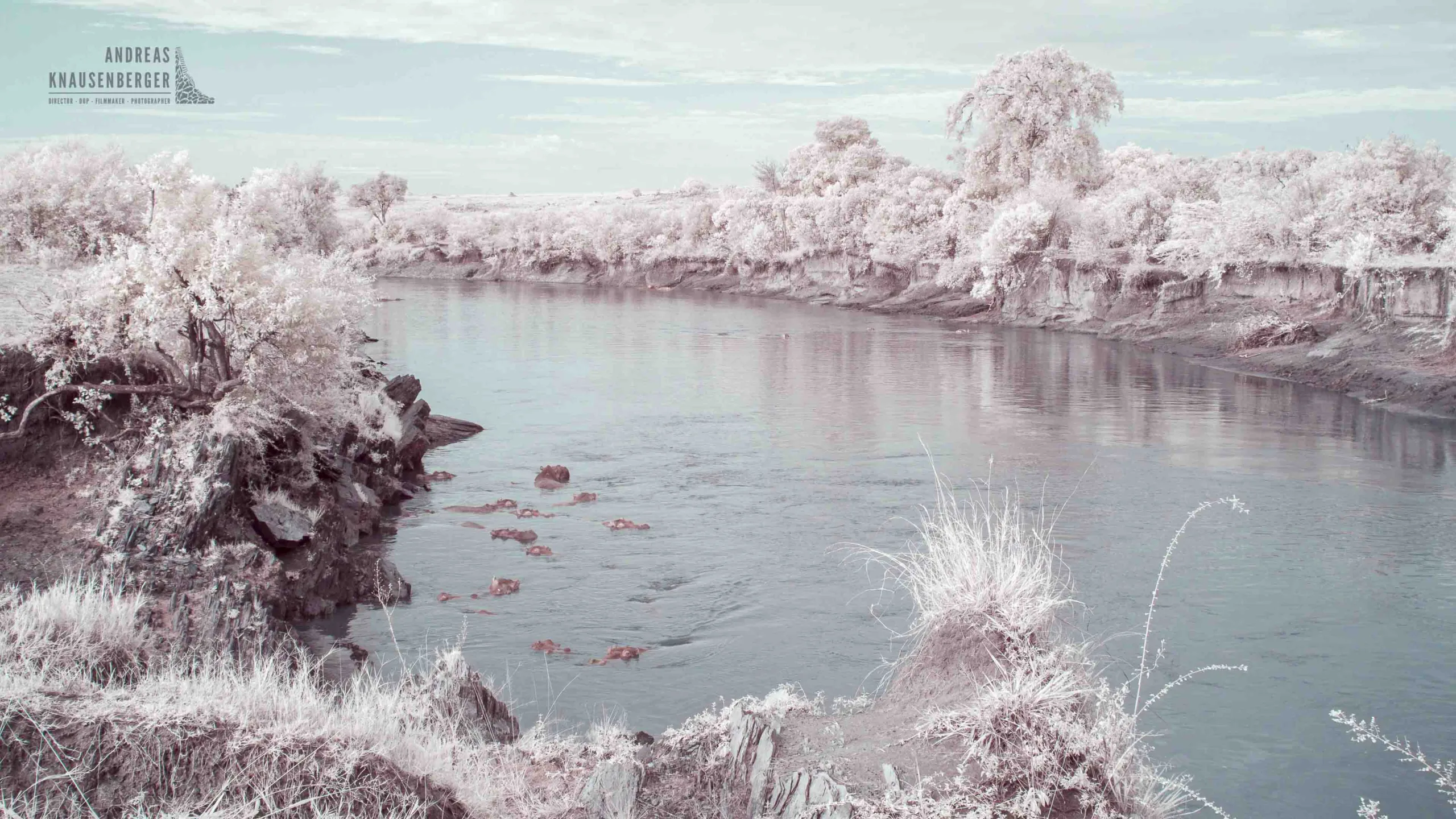 The Mara River also provides great infrared opportunities: the water appears black, hippos stand out beautifully, and the foliage turns completely white.