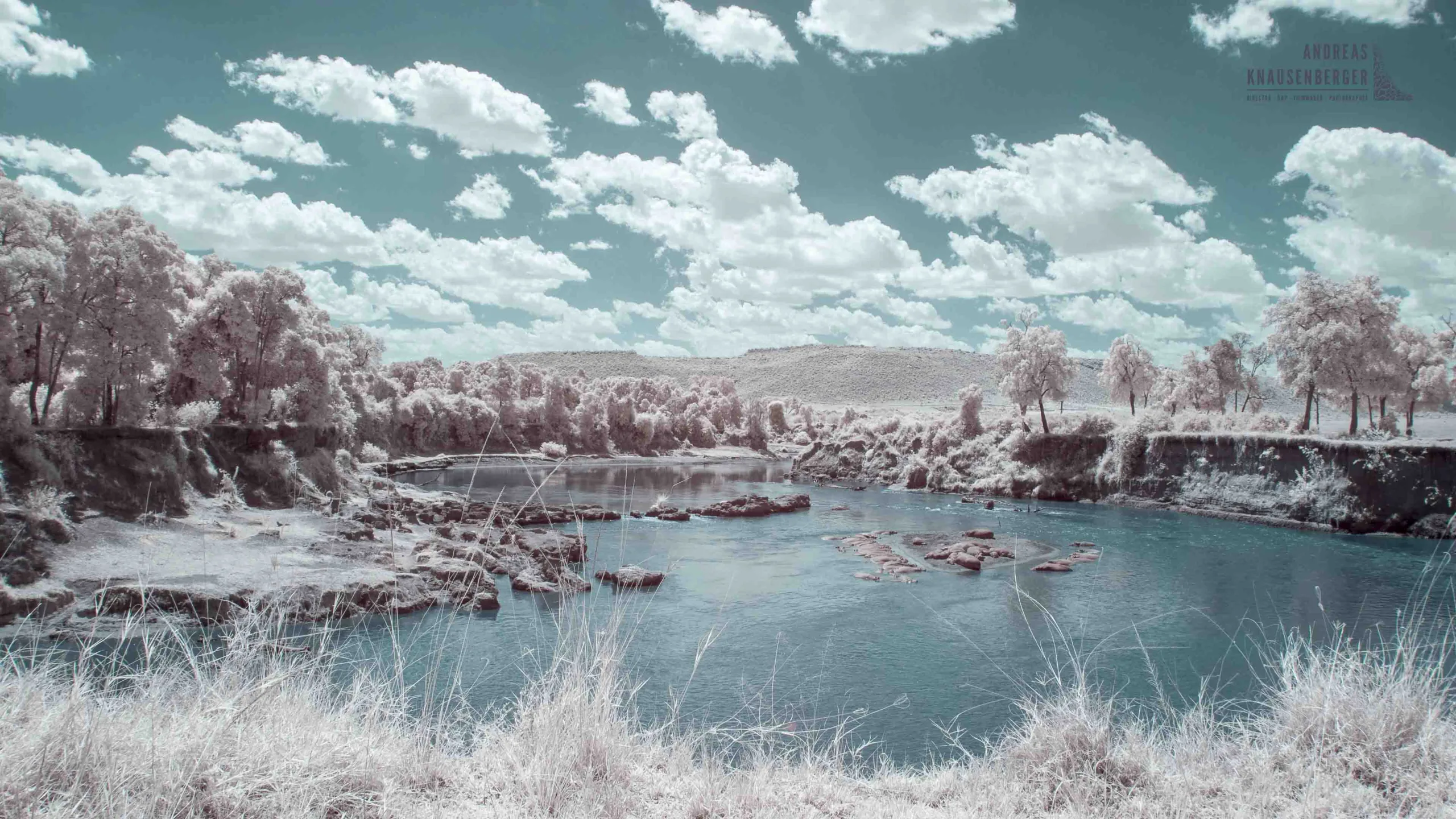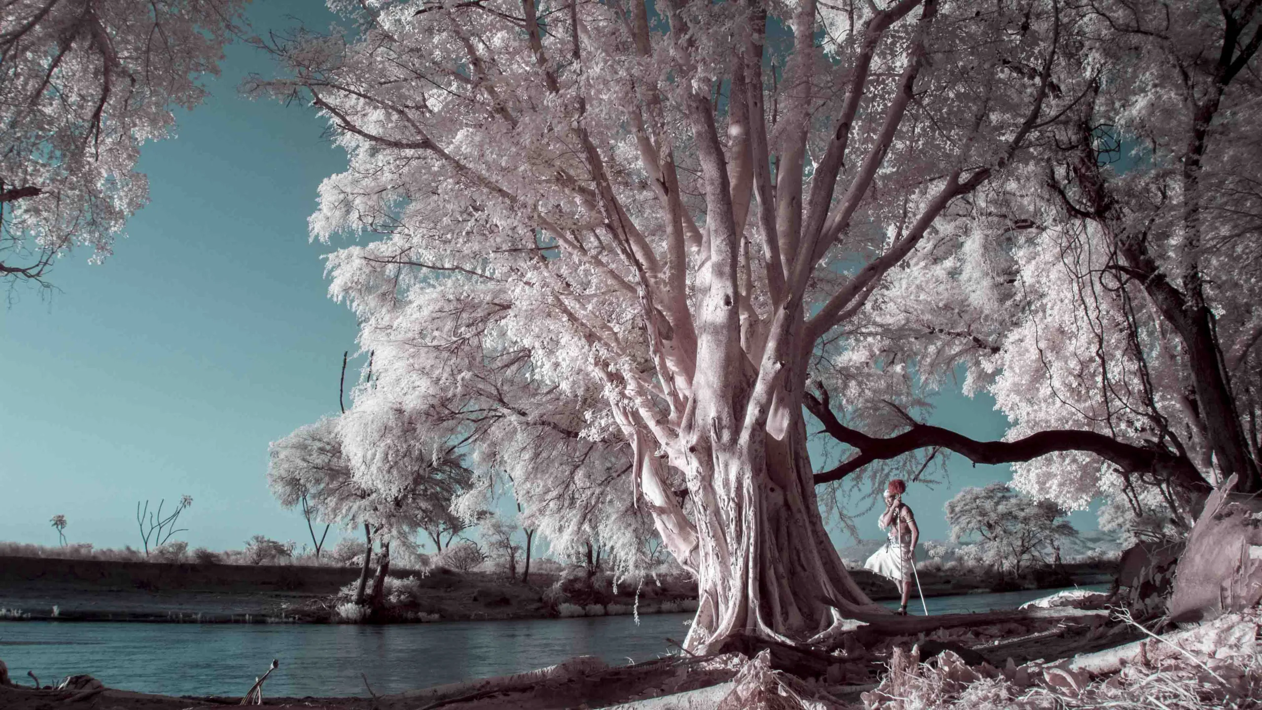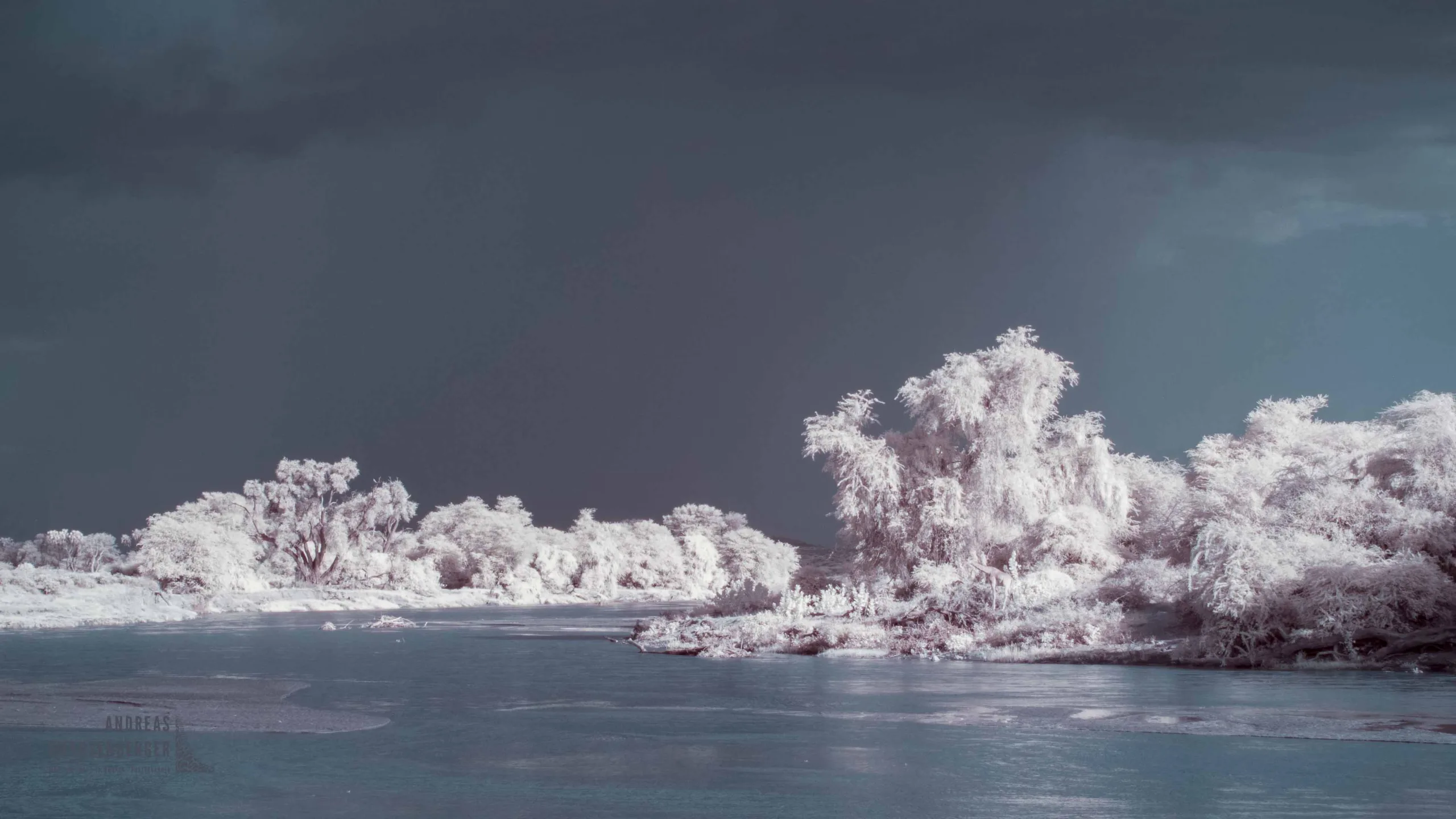 In post-processing, you have some creative freedom. A standard infrared wildlife photography image (720 nm) will show a brown/orange sky, white foliage, and deep contrasts—a striking look. But if you want a blue sky, you can perform a color swap in Photoshop, switching the red and blue channels.