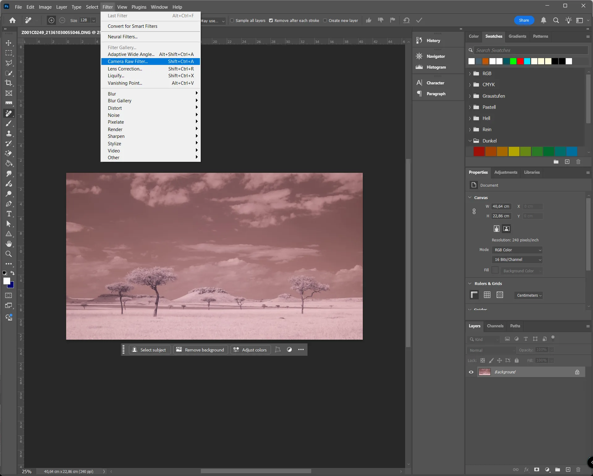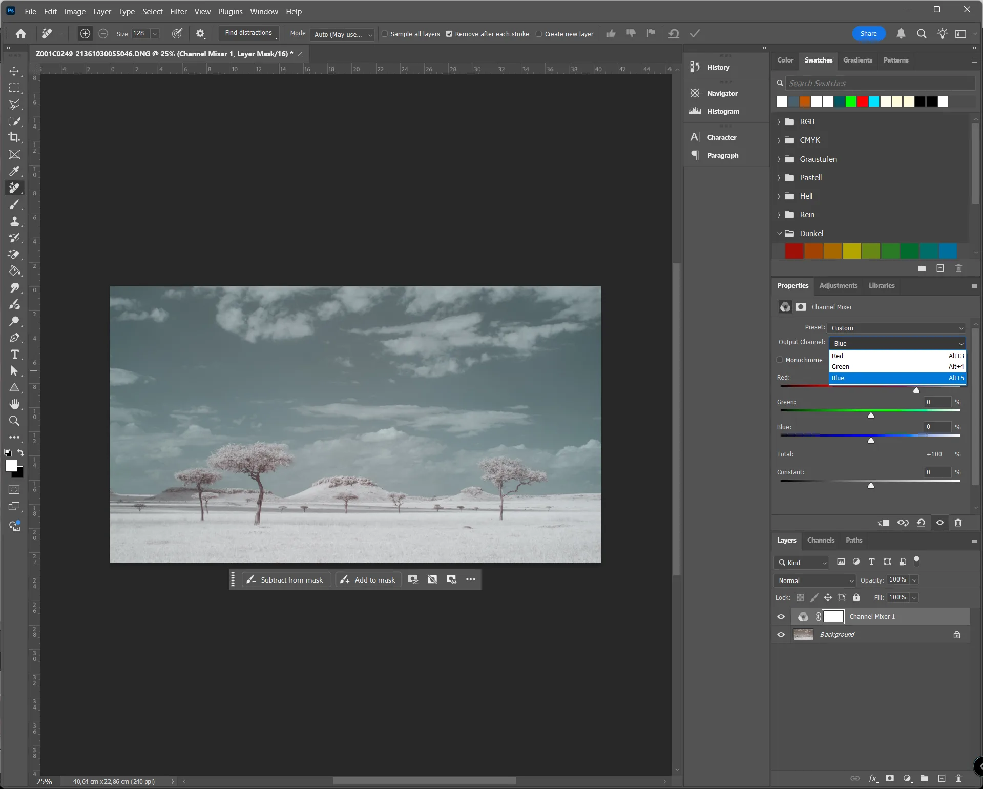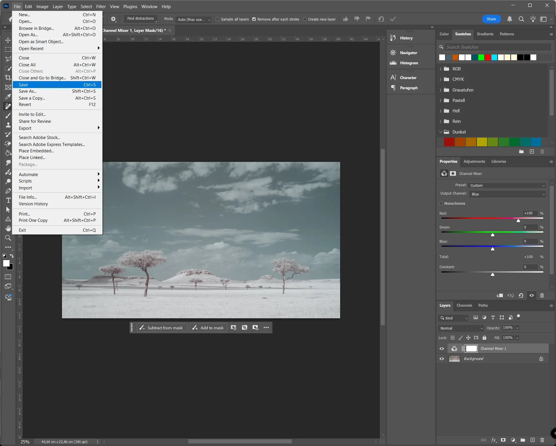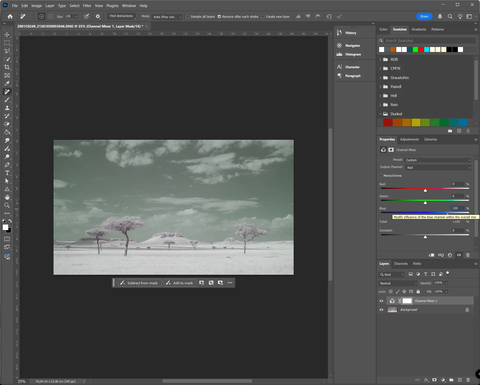 In post-processing, you have some creative freedom. A standard infrared wildlife photography image (720 nm) will show a brown/orange sky, white foliage, and deep contrasts—a striking look. But if you want a blue sky, you can perform a color swap in Photoshop, switching the red and blue channels.