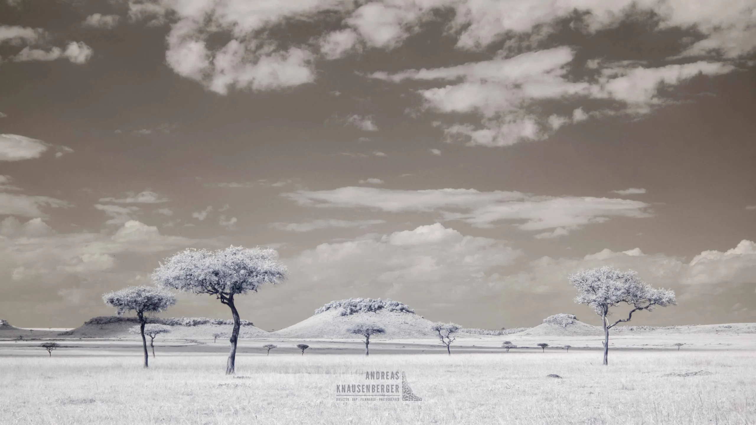The Masai Mara is one of the most rewarding destinations for infrared wildlife photography. I realized quickly that you need more than just the animal itself in your frame. Since foliage looks so striking in IR, it’s important to include interesting trees and bushes. Forests, riverbanks, or solitary trees add something special to your composition.