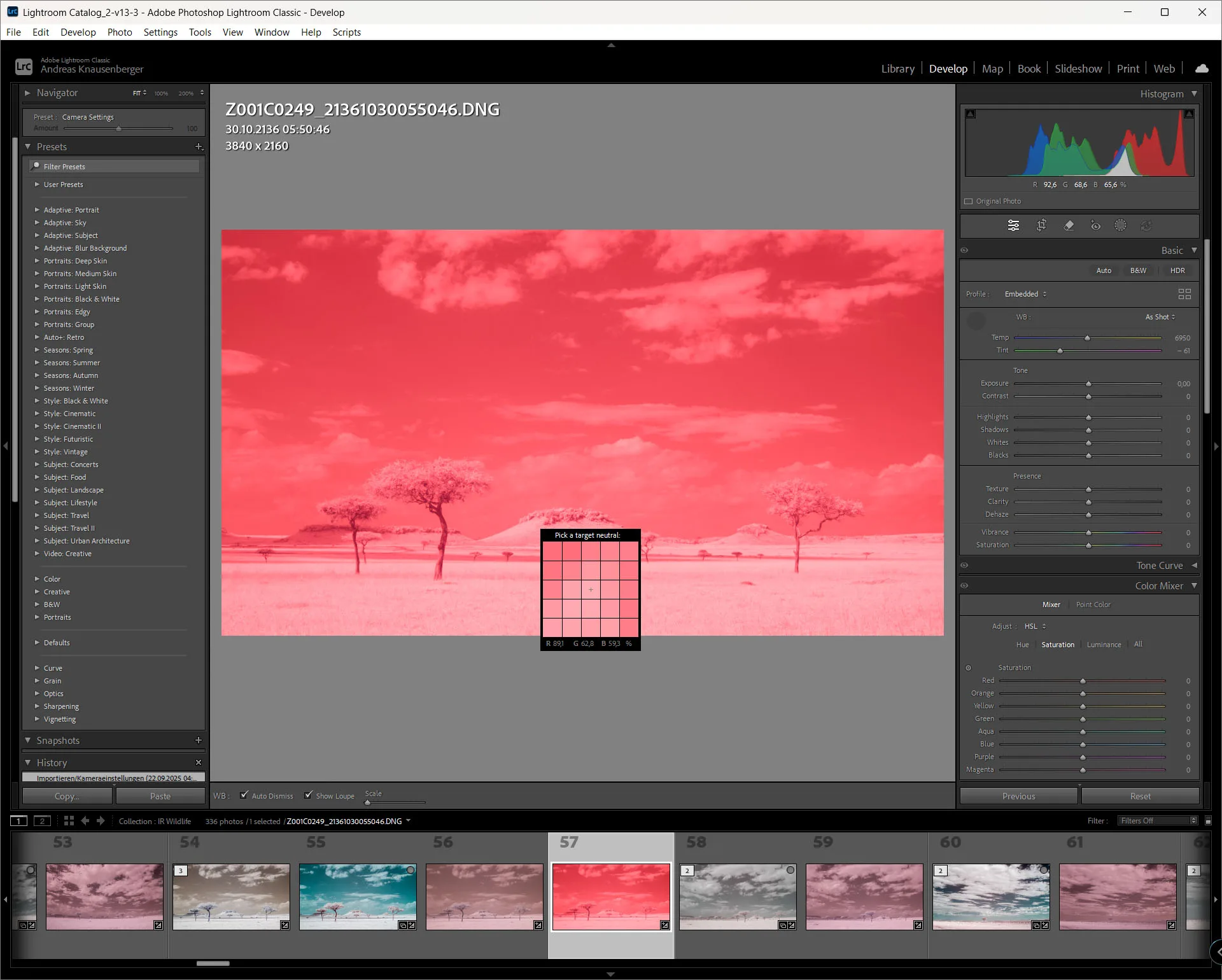 After long days in the bush, I couldn’t wait to start editing. Before leaving, I had done some quick test edits but wasn’t happy with them. Since the Z Cam produces an unusual DNG format, there were no Lightroom Classic presets available for proper white balance, and I couldn’t create my own profile. But I found a workaround!