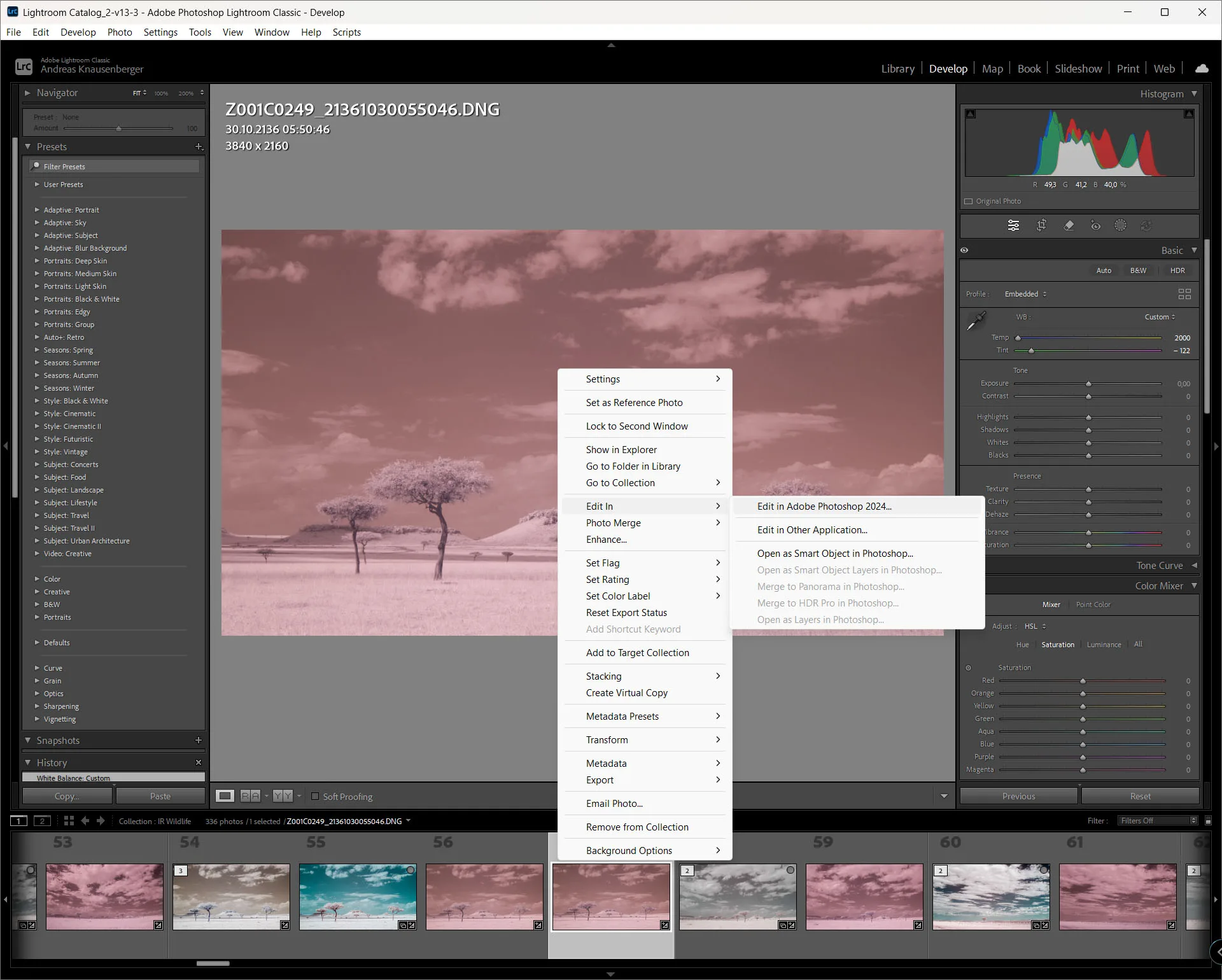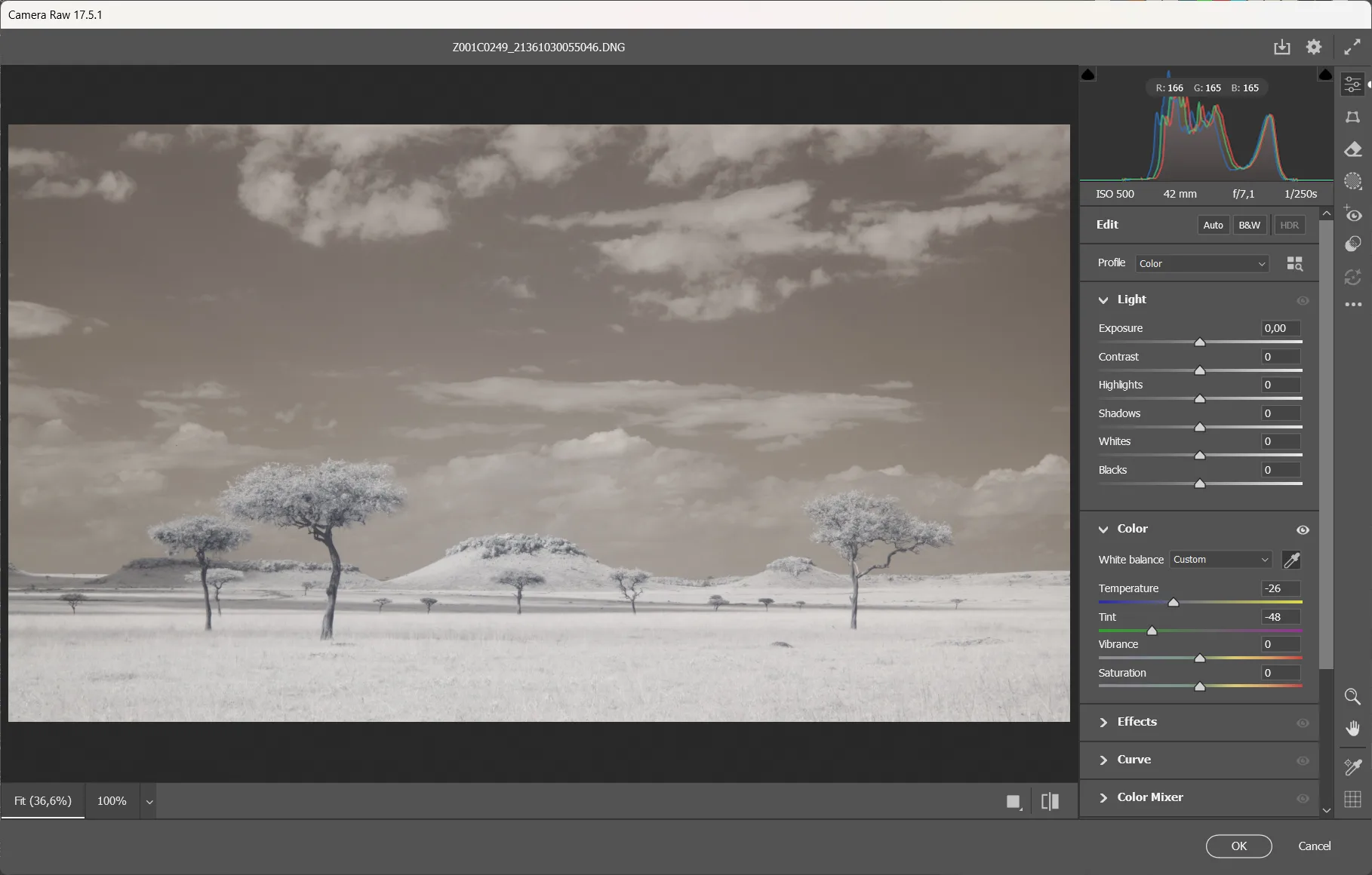 - In Photoshop, open Filter → Camera Raw Filter, and white balance again. This solves Lightroom’s white-balance limitation (Lightroom stops at –2000 K).